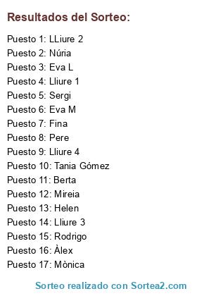Lista de participantes: Àlex, Mònica, Sergi, Fina, Eva M, Núria, Eva L, Tania Gómez, Mireia, Helen, Rodrigo, Berta, Pere, Marc Ylla, Josep Mª, Lliure 1, Lliure 2.