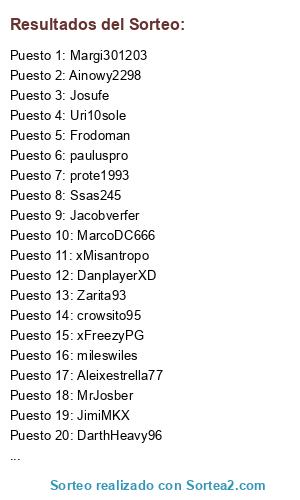 Lista de participantes: chechar74(1), bertita(1), granbalduc(1), polfd91(1), Disordeer(1), mekkaniviar(1), otakuboy2001(1), Aina0428(1), Margi301203(1), JuliusCaesar6(1), moalma81(1), Xordi(1), jomb1989(1), MagnetoAV4(1), Rubron(1), goyogem(1), hadish27(1), Adriano2804(1), XiquetdeReus(1), Laiadl(1), MarcoDC666(1), futskito(3), Lupitacuervo(3), Uri10sole(3), Mogwai33(3), muriburyland(3), Burp13(3), Zarita93(3), Kegrion(3), paumartus(3), nysdar(3), AnnaMireia(3), killcows(3), GalloperExceed(3), pauluspro(3), AleixAru(3), MelaniePuerto(3), TRCyclic(3), lSombra(3), MrJosber(3), Totemon1982(3), Noelle(3), fgdhhwxd3(3), PotatoKun01(3), DanplayerXD(3), Mistercrock(3), Ssas245(3), prote1993(3), Gerardhino10(3), SrSopabuena(3), xMisantropo(3), Faltapro(3), utcas(3), crowsito95(3), TitusGrabu(3), albertussh(3), JimiMKX(3), WonsWanted(3), Jacobverfer(3), ItsJusss(3), Layd0615(3), PolBoom77(3), NekoCientifico(3), xFreezyPG(4), Josufe(5), fhkbp(5), iBerny38(5), IlloBerny(5), Ainowy2298(5), DarthHeavy96(5), Axerry(5), Aleixestrella77(5), velucidad(5), bolgvs(6), mileswiles(6), Frodoman(6).