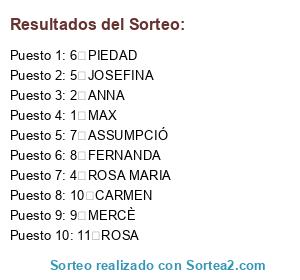 Lista de participantes: 1 MAX , 2 ANNA , 3 SANTI, 4 ROSA MARIA, 5 JOSEFINA, 6 PIEDAD , 7 ASSUMPCIÓ , 8 FERNANDA, 9 MERCÈ , 10 CARMEN, 11 ROSA , 12 MONTSERRAT.