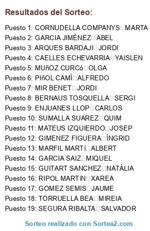 Lista de participantes: AGUILAR MOLES NURIA, AGUSTI ROCA JOSEP MARIA, AIXALÀ CULLERÉ EDUARD, ALAMAN IBIZA RUBEN, ALBERT MELIS NúRIA, ALBINO RAMíREZ JORDI, ALCÀNTARA RODRÍGUEZ NÚRIA, ALEXANDRE GóMEZ VíCTOR, ALTISENT PRUNERA ELISABET, ALTISENT SANAHUJA M.CARME, ALTISENT SANAHUJA MARTA, AMENóS AMPURDANéS ANTONI, ARMENGOL TEIXIDO ARNAU, ARNAU GARCIA LLUIS, ARQUES BARDAJI JORDI, ARQUES BARDAJI GEMMA, ARQUéS GORGUES JOSEP MARIA, ARQUÉS GORGUES JORDI, ARRUFAT GONZALEZ RAMON, ARRUFAT VILAMAJÓ PAU, BADIA GARCIA SERGI, BADORREY GOMICIA SUSANA, BAJONA CASES JOSEP, BAJONA CERCÓS ORIOL, BALASCH VILARO JOSEP MARIA, BALSELLS SALES ÒSCAR, BAQUEDANO BAQUEDANO JOSE ENRIQUE, BAQUEDANO OT VICTOR, BARRASA DÉU ISONA, BARRUFET GONZALEZ EVA, BARRUFET ROSINACH RAMON, BARRUFET SEGARRA GERARD, BARRUFET SEGARRA PAU, BATALLA FOIX ROSA, BEÀ BARRUFET Mª ESTHER, BEA CAPDEVILA MARIA, BEIRO GONZALEZ PACO, BELLMUNT VALLèS CECíLIA, BERGUA MUñOZ JOSEP MARIA, BERNAT NATàLIA, BERNAUS TOSQUELLA SERGI, BERTRAN MARTI ANTONI, BESORA ARDIACA JUDIT, BOADELLA IBAñEZ JORDI, BONET OLIVART ANNA, BONET OLIVART JOSEP, BONET OLIVART RAMON, BONET PAU ABEL, BONET PAU ALBA, BONET SOLE MARIA ISABEL, BORDA FORTUNY SANDRA, BORRàS SOLé MARIA TERESA, BOSCH SALLA RAMON, BOSCH SALLA ANNA, BOSCH SARDAñONS ANTONIETA, BUIRA BOIRA MARIA, BUIRA CARULLA CONCEPCIÓ, BUIRA RUBIO RAMONA, CABÚS BARRUFET DOLORS, CABUS CORNUDELLA MERCè, CABUS JOVE MIQUEL, CAELLES ECHEVARRIA YAISLEN, CAMí BUIRA ISIDRE, CAMí GARANTO CARLA, CAMí MOR MARTA, CAMPILLO BETBESé MANEL, CANO DEL SOL AIDA, CAPATA ELENA, CAPDEVILA ESPASA ANTONIETA, CAPDEVILA RONEU EDU, CAPDEVILA SUBIRà MARIONA, CAPELL AIDA, CAPELL JORDI, CARBONELL CITOLER AGNÈS, CARDIL JOVE JOEL, CARDIL RIO JORDI, CARRERA MANSILLA SUSANA, CARRILLO SERRADELL FRAN, CARRIZO IBARRA VICENTA, CASADELLA QUER XAVIER, CASADELLA QUER JORDI, CASES VIDAL Mª ELENA, CASTILLO HERNANDEZ MARIA DE LOS ANGELES, CAVA VILA JORDI, CERCÓS FARRÀS ANNA, CHICA ROCA NURIA, CLOSA VILARDELL ROGER, CORNUDELLA COMPANYS MARTA, CORNUDELLA GUIU MONTSE, CORNUDELLA QUER PAU, CORRETGé OLIVART MARIA ROSA, CORRETGER OLIVART JOSEP MARIA, CORTES FLIX ESTER, CORTES FLIX ANNA, CORTÉS TEIXIDÓ ALBERT, CUADRAS LLORCA CARME, CUNILLERA SABATÉ BLANCA, CURCó ALBUIXECH DAVID, CURCó RIUS DOLORS, DE MONTEYS SEGURA JORDI, DE SOLà GóMEZ GEMMA, DIVORRA MONTAñA GEMMA, DOLCET CABASES ALBERT, ENJUANES LLOP CARLOS, ESCOLà CLOSA ENRIC, ESTEVE TIRADO JOSEP, FARRAN JULIà ÀNGEL, FARRE COLL JAUME, FARRE SALLA RAMON, FIñANA ALBA, FIñANA SILVIA, FONT SETEVE MIQUEL, FONTANET RHONI NADIA, FONTOVA PONS ANNA, FORNER FORNER ANGEL, FREIXES SANS JANA, FRESNO AMATE MIGUEL, FUSTA SOLSONA FRANCESC, FUSTA SOLSONA CARLES, GABARRA GOU JOAN, GABARRA GOU ÀNGELS, GABARRI JIMéNEZ ESTHER, GANDIA VENTURA MARIO, GARCIA JIMENEZ TONI, GARCIA JIMÉNEZ ABEL, GARCíA JIMENEZ NIKO, GARCIA SAIZ MIQUEL, GARCIA SANS PAULA, GELONCH BOSCH JOSEP, GELONCH COLOM RAMON, GELONCH I ROSINACH OLGA, GELONCH LLOVERA NOEMI, GELONCH MATEUS ROMÀ, GELONCH NICOLAS JOAN, GELONCH NICOLAS ANNA, GELONCH NICOLAS JORDI, GELONCH QUER JAN, GELONCH QUER ARES, GENÉ GRANADOS AINA, GIL PAULS LAURA, GIL SáNCHEZ JORDI, GILART BOQUE TONI, GILI GORGUES ANNA MARIA, GIMENEZ FIGUERA ÍNGRID, GINOVART FUSTER MARC, GIRVENT LóPEZ ANTONI, GOMES PARIS ALBERT, GóMEZ ISAAC, GOMEZ LOZANO MARIO, GOMEZ SEMIS JAUME, GONZALEZ PALLARES SILVIA, GRACIA OCHOA MARIA, GRAU VISA TERESA, GUICH ESCOLANO MIQUEL, GUICH JIMENEZ JAN, GUICH JIMENEZ àXEL, GUILLAMET BADORREY LAIA, GUILLAMET SANTANDREU RAMON, GUITART SANCHEZ NATÀLIA, HERNANDEZ ROMERO MANEL, HIDALGO PIñOL ELI, IBAñEZ JANA, JIMENEZ SALMERON RAQUEL, LAHUERTA REIG JORDI, LANASPA PUYAL ÓSCAR, LECHA MARCOS MONTSE, LLANES SAGARRA LAURA, LLAURADó PAJARES ENRIC, LLOBERA GORGUES ALBERT, LLOVERA ROSINACH AIBERT, LLOVERA ROSINACH XAVIER, LLOVERA TELLA JOSEP, LOPEZ GUILLAMET MDOLORS, LUCAS MORENO CRISTINA, MACIà ARBóS JORDI, MARFIL MARTí ALBERT, MARTí GONZáLEZ MARC, MARTí OLIVART ADRIà, MARTíN ESPINOSA LUCíA, MARTíN GARCIA DAVID, MARTIN GILI LAIA, MARTíN SEVILLA VIRGINIA, MARTIN TORRUELLA FRANCESC, MARTINEZ VILLELLAS DANIEL, MAS CARRE FERRAN, MASBERNAT MONTANYOLA JOSEP, MATEU IZQUIERDO CRISTINA, MATEU IZQUIERDO SANDRA, MATEUS BONET GAL.LA, MATEUS BONET JOFRE, MATEUS CALDERó AïDA, MATEUS IZQUIERDO JOSEP, MATEUS SALLA CARME, MBALL0 HOUSSANATOU, MILLA MORA JOSE, MINGUELLA PONS ALBA, MIR BENET JORDI, MIRET BERROCAL JORDI, MODESTO ROURE LLUIS, MOLERO PEREZ Mª PAZ, MOLES TORRENT ASSUMPCIO, MONZON MANSO JAVI, MONZóN MANSO AINTXANE, MOR TRIQUELL ANNA, MORENO CAPDEVILA ORIOL, MORILLAS SANCHEZ JORGE, MORLANS SANS JOSEP MARIA, MOTLLó CAELLES MARTA, MUñOZ CURCó OLGA, NICHOLSON SABATé NATHAN, NICOLAS GELONCH MAGDA, NICOLAU INGLES JORDI, OLIVART MOR LAURA, OLIVART PAREJO PERE, OLIVART SALLA JOSEP, OLIVART TORRENT RAMONA ROSA, ORIOLA I ROSINACH SONIA, ORTEU BOSCH CRISTINA, ORTEU CORTéS ANTONI, ORTIZ CARBONELL ANTONI, ORTIZ SANTACANA BERTA, OT ESTABLE ANTONIA, OTTO GINE ALEX, OTTO TORRUELLA ALEX, PADROSA DANéS GUILLEM, PAGES CARLOTA, PALLEJA FIGUERAS LAURA, PALLEROLA MATEUS GEMMA, PALLEROLA RIUS SALVADOR, PALLEROLA RIUS GERARD, PASARRIUS MONTAGUT AITOR, PASTÓ LLOBERA RICARD, PAU ABELLA XAVIER, PEIRET DE LA FUENTE CARLES, PEIRó CASES MONTSE, PEIRÓ CORTÉS NEUS, PEREZ LLENA SERGIO, PIñOL CAMÍ ALFREDO, PONS CAMí ESPERANçA, PONT SANCHEZ CRISTINA, POP ELISIO MAXIMILIAN, PRUNERA M TRESA, PUERTAS INSA MANEL, PUIG JIMENEZ MONTSE, PULIDO CAMACHO LEO, QUER RAVéS ANNA, QUERALT MATEU ROSER, RAMíREZ PASCUAL JORDI, REBORDOSA LLIBERATO JAUME, REGALADO SANCHEZ ANGELS, REQUESENS RODRÍGUEZ RAMON, RESA ENRICH LAIA, RIPOL MARTíN XAREA, RIPOL MARTíN VIOLETA, RIPOL VALENTíN ÓSCAR, ROCA AIXALA RAMONA, ROCA AIXALà JOAN, ROCA ALTISENT OLAF, ROCA ALTISENT CESC, ROCA IBARS FRANCESC XAVIER, ROCA SANTOS ESTHER, RODRíGUEZ PERERA LAIA, ROFES BARCELO JOSEP, ROLLIZO HERAS MONTSE, ROSELL SOLé NATàLIA, ROSINACH BONET JORDI, ROSINACH GARRIGA MERCE, ROSINACH MIR LAIA, ROSINAC