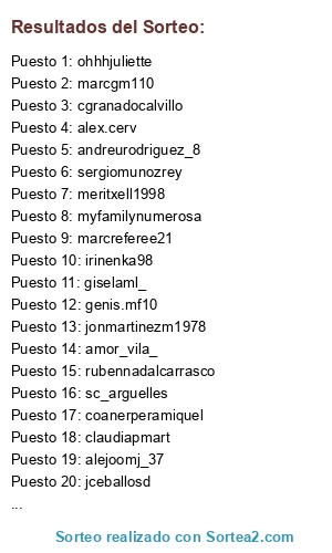 Lista de participantes: lauriii_0023(4), stwandreu(4), omar_betmi, eduu.canaals(3), fatimadiabya(3), babyyy_nereax, genis.mf10(14), mitugal(2), dianarevi(4), joanpuigclosca(4), maitemuli, marcreferee21(6), jceballosd(6), irinenka98(8), soniagiga, gelssales1980(4), amor_vila_(9), blaufut_11(14), nereeamendoza(5), ohhhjuliette(7), cgranadocalvillo, alexadalmau, annamaso(5), marcgm110(4), marisopa74(5), sergiomunozrey(36), alex.cerv(15), myfamilynumerosa(33), jordi_0407, merce_cortina, jonmartinezm1978(4), evaardilafreire, love_42_43(3), dudi.love79(2), rubennadalcarrasco(10), montse.aparicio(3), akka._al3xit0fnla_21, willy.27, santanems, monicalopezbonet, alejoomj_37(2), sc_arguelles(21), giselaml_(7), joanpol5(5), promisesmontseny, joseprofsala(5), montseorra_68(4), miimmii414(2), claudiapmart, coanerperamiquel(7), dibuixairene(11), musta.ej, maricarmemunozga(4), juliareymartin(6), adaa.ap14(3), esteruca2006(3), andreurodriguez_8(30), meritxell1998(12), antonirouraa.