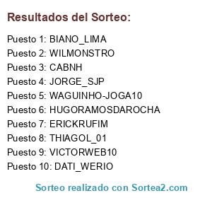 Lista de participantes: VICTORWEB10, DATI_WERIO, BIANO_LIMA, THIAGOL_01, JORGE_SJP, ERICKRUFIM, CABNH, WAGUINHO-JOGA10, WILMONSTRO, HUGORAMOSDAROCHA.