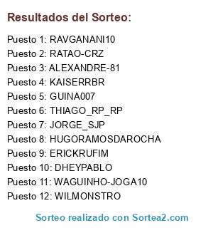 Lista de participantes: RATAO-CRZ, RAVGANANI10, ERICKRUFIM, WILMONSTRO, JORGE_SJP, GUINA007, WAGUINHO-JOGA10, HUGORAMOSDAROCHA, DHEYPABLO, THIAGO_RP_RP, ALEXANDRE-81, KAISERRBR.