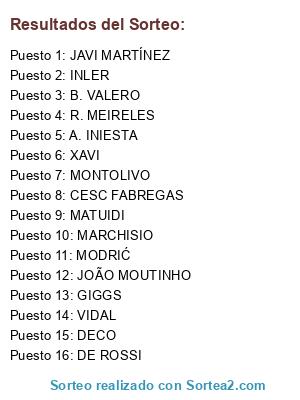 Lista de participantes: A. INIESTA, XAVI, CESC FABREGAS, DE ROSSI, MODRIĆ, MARCHISIO, DECO, VIDAL, JOÃO MOUTINHO, GIGGS, R. MEIRELES, JAVI MARTÍNEZ, B. VALERO, INLER, MONTOLIVO, MATUIDI, .