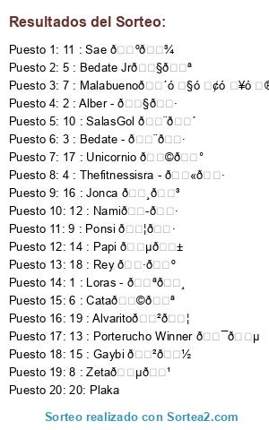 Lista de participantes: 1 : Loras - 🇪🇸, 2 : Alber - 🇧🇷, 3 : Bedate - 🇨🇷, 4 : Thefitnessisra - 🇫🇷, 5 : Bedate Jr🇧🇪, 6 : Cata🇩🇪, 7 : Malabueno🏴, 8 : Zeta🇵🇹, 9 : Ponsi 🇦🇷, 10 : SalasGol 🇨🇴, 11 : Sae 🇺🇾, 12 : Nami🇭🇷, 13 : Porterucho Winner 🇯🇵, 14 : Papi 🇵🇱, 15 : Gaybi 🇲🇽, 16 : Jonca 🇸🇳, 17 : Unicornio 🇩🇰, 18 : Rey 🇷🇺, 19 : Alvarito🇲🇦, 20: Plaka.