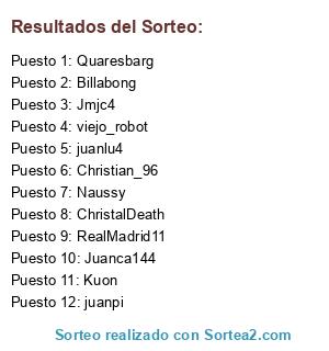 Lista de participantes: Jmjc4, Juanca144, ChristalDeath, Billabong, Christian_96, juanlu4, Quaresbarg, juanpi, viejo_robot, Naussy, Kuon, RealMadrid11.