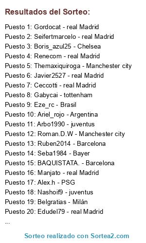 Lista de participantes: Panda.cabj - Barcelona, Enzofernandez7 - Chelsea, Gonzalo rito - PSG, Boris_azul25 - Chelsea, Alex.h - PSG, Gordocat - real Madrid, Nelsonlucybell - Manchester utd., Famr1989 - Manchester city, Seifertmarcelo - real Madrid, Matiasufc155 - Barcelona, Belgratias - Milán, Nicolasmathias - arsenal, Ruben2014 - Barcelona, Mati-gti89 - real Madrid, Sticker - real Madrid, Roman.D.W - Manchester city, OLLER - real Madrid, Nacho rc - Barcelona, Arbo1990 - juventus, Fedecarp17 - real Madrid, Mou27 - galatasaray, Eze_rc - Brasil, ScaYra - real Madrid, Fedinho - napoli, Gabycai - tottenham, Jul.i.am - Manchester utd, Jeison - Barcelona, Brandonsilveira - Bayer, Vitorsfc - Barcelona, Jorge meler - Manchester city, Gegengue - Bayer, RAMAFULL - Real Madrid, Zeta - napoli, Nicotinestain - real Madrid, Chester mg - Bayer, Bestianegraa - real Madrid, Rodri74 - real Madrid, Juankstigma - real Madrid, Ppe penta - España, Rembecuadro - Colombia, Guasti -, Gustavodasilva- Uruguay, Taladro09 - inter, Paulosfc - Barcelona, ANTONIMO - Manchester city, Ceccotti - real Madrid, Kurilin - Manchester city, Davigol - Barcelona, Damian795 - Barcelona, Renecom - real Madrid, Nashoif9 - juventus, Ariel_rojo - Argentina, Javibarqui - real Madrid, Manjato - real Madrid, LDN - Brasil, Mattimolina - real Madrid, Tony23 - Manchester city, Andresmoron - juventus, Seba1984 - Bayer, Fitofaraias - Chelsea, Dkl_mdustt - Brasil, Jmfjbill - real Madrid, BAQUISTATA. - Barcelona, Themaxiquiroga - Manchester city, Galan1979 - Manchester city, NOOB - real Madrid, Pablomauro - Bayer, Terabin - Chelsea, Javier2527 - real Madrid, Cambur - juventus, Feliu - Manchester city, Dyegol - Barcelona, Arku - PSG, Pellejunior - real Madrid, Polastoo - Barcelona, Edudel79 - real Madrid.