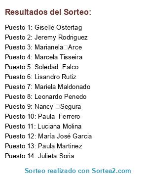 Lista de participantes: Mariela Maldonado, Fernanda Díaz, Miguel Castillo, Marcela Tisseira, Marianela Arce, Soledad Falco, Paula Ferrero, Leonardo Penedo, Lucas Brito, Luciana Molina, Paula Martinez, Julieta Soria, Nancy Segura, Lisandro Rutiz, Jeremy Rodriguez, María José Garcia, Giselle Ostertag.