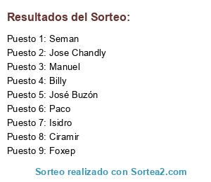 Lista de participantes: Paco (10), Ciramir (1), Jose Chandly (10), Billy (10), Seman (10), José Buzón (10), Isidro (1), Foxep (1), Manuel (10).