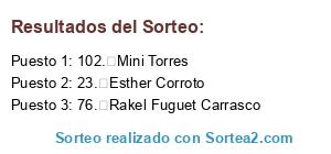 Lista de participantes: 1. Yolanda Gonzalez , 2. Beatriz Valle Garcia , 3. Natalia Prieto Garcia , 4. Vanessa Fernandez , 5. Sonia Garate Embid , 6. Repostería Milemo , 7. Miriam León Morandeira, 8. Sandra Ferré, 9. Montse Fernandez Martin, 10. Conchi Garcia Nieto, 11. Mizu Sama , 12. Luisa Menargues, 13. Ángel López, 14. Miriam Juarez Fernandez, 15. Susana Gómez Duarte, 16. Chaskita Bernacer, 17. Celeste Ciapponi, 18. Albert Delgado, 19. Maria Jose Terrero, 20. Los Trapitos De Esther Los Trapitos de Esther, 21. Veronica Vizcaino, 22. Teresa Villalba, 23. Esther Corroto, 24. Los Detalles De La Rubia, 25. Toñi Martinez Telechea, 26. Albert Delgado Pérez, 27. Carmen Ro, 28. M Isa Bel R, 29. Beatriz Marcos, 30. Ana Bermudez Pelaez, 31. Yoly Lopez, 32. Cristina Alonso, 33. Antonio Pérez Enrique, 34. Maria Fernandez Tor, 35. Silvestre Benavente Martinez, 36. Katy Martinez Hernandez, 37. Juan Eduardo Benavente Martinez, 38. Silvestre Benavente Macanas, 39. Inma Menacho, 40. Mónica Prieto García, 41. Moli Val, 42. Yessica Lloret Márquez, 43. Giinger Ordooñez, 44. Mercedes Gil Campos, 45. Carmen Blanco F, 46. Toñy Torres, 47. Susana Gonzalez Castilleros, 48. Encarni Garcia, 49. Noelia Escribano López, 50. Barbara Llana, 51. Nagore Arostegui Rojo, 52. Fina Benavides, 53. Núria Garcia , 54. SobreCueros, 55. Silvina Gancera, 56. Sophia Sanchez Peña, 57. Carina Gonzalez, 58. Erika Montes Pérez, 59. Belen Garcia Luque, 60. Eva Camps, 61. Isabel Aragües, 62. Javier Gonzalez, 63. Felisa Martinez Castellano, 64. Diana Sinmas, 65. Carlos Iglesias, 66. La Anjana Manualidades, 67. Manuela Galván, 68. Etiquetas Para Manualidades, 69. Silvia Fontao, 70. Marian Regalado Lopez, 71. Angels Ed, 72. Mariló Salmerón Fernández, 73. Alejandro Pérez, 74. Maite Marin Farre, 75. Carmen Salv, 76. Rakel Fuguet Carrasco, 77. Mami Duna Carolina, 78. Manuela Lumbreras, 79. Sonia Méndez Rodríguez, 80. Irene Masip Morte, 81. Andrea Haro, 82. Ana Belen Garcia L, 83. Ana Navarro, 84. Cristina Expósito Fouz, 85. Marta Garcia Alonso, 86. Maribeco Cp , 87. Montse Fernandez, 88. Maria Sanz Rivera, 89. Buscador de Sorteos, 90. Chelo Moa, 91. Maria Ortega Gomez, 92. Natalia Garch, 93. Azu Cigales, 94. Yolanda Morancho Martinez, 95. TuBibe Tartas de Pañales, 96. Luz Divina Vega Luján, 97. Gemma Arbós, 98. Uve Ro, 99. Bellita RG, 100. Josefina Mar Yub, 101. Nuria Perez Ortega, 102. Mini Torres, 103. Josefa Gálvez Lanzas, 104. Joan Galvez Lanzas, 105. Julia Lanzas Orejuela, 106. Sandra Balaguer Rodriguez, 107. Miriam Abad Navarro, 108. Mónica Martín García, 109. Sandra Cabrero Lucas, 110. David Pereira Martínez , 111. Carmen Castro Lamelas, 112. Ana Alonso Corral, 113. Maria Jose Saez Fernandez, 114. Betty Salamandra, 115. Veronica de Carolis, 116. Francisca Martinez Ouviña, 117. Irene Parrón Reus, 118. Pili Pons, 119. Pilar Gil Costa, 120. Pepi Romero Alvarez, 121. Charo Romero Álvarez, 122. Concepción López DEL Castillo, 123. Magdalena Sanchez Mendez, 124. Paqui Sanchez Mendez, 125. Beny Ojeda Carlos, 126. Chiky Articulos De Regalo Chiky, 127. Cintia Soto Saiz, 128. Lucia Xaica, 129. Maria Gamarra Marcos, .