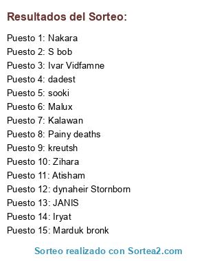 Lista de participantes: Atisham, Malux, Nakara, JANIS, Kalawan, S bob, Marduk bronk, Painy deaths, Ivar Vidfamne, Iryat, sooki, kreutsh, dadest, dynaheir Stornborn, Zihara.