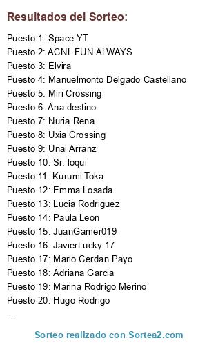 Lista de participantes: Ana destino(3 participaciones), Paula Leon, JuanGamer019(2 participaciones), Miri Crossing(3 participaciones), Sr. loqui(5 participaciones), Space YT(3 participaciones), Manuelmonto Delgado Castellano(3 participaciones), Emma Losada(3 participaciones), Lucia Rodriguez(3 participaciones), Unai Arranz, Lourdes Macias Diaz, Elvira(21 participaciones), Uxia Crossing(3 participaciones), Marina Rodrigo Merino, ACNL FUN ALWAYS(9 participaciones), JavierLucky 17, Adriana Garcia(2 participaciones), Mario Cerdan Payo, Hugo Rodrigo, Nuria Rena, FRANCINA T.V., Kurumi Toka.