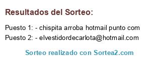Lista de participantes: simplesoperfect(arroba)gmail.com, @dosenlapasarela, @juliaer, @lollipops1989, - softandgrey(arroba)hotmail.com, @borainilla, @siue_marian, - nurgagi(arroba)gmail(punto)com, @taniavr82, - blanki2040(arroba)hotmail(punto)com, @-patriziapg86, @elvestidordecarlota, @sweetsyte, @info, @annitaprats, @iriavazquez89, @silfahada, @ssil7165, @anatejasfin, @violetachiquero, @midiariomaschic, @saiotxu_, @africasotoestrada, @belensoto, - angeles.casas(arroba)gmail.com, @laurusita, @tardesa, @younicayo, @crisbath, @estercicablue, @piradma, @lajovenmorla, @nortona22, @chipiroca, @nube70blanca, @pincelata, @marialcay, @happiestmony04, @entrenubes, @mariamorsen, - chispita arroba hotmail punto com, @lachaty54, @conejuela2, @buxa9, @yoybamby, @vereda.mare5, @fisiwoman, @suerta87, @glamurosa.fe4, @jewelstyle, @xacobeanicol, @cocude, @chatungaee, @lulunoa, @satelitas, @daikirilila, @talcuali, @morsent4, - volcama(arroba)hotmail(punto)com, @atreyura, - dechiripastyle.blogspot.com, @mayoret4, @macapre, @bimbaya, @pablicocas, @finiasa, @ladycristal, @cristinita200, @hechizzerapink, @sinsolmar, @mayandyou2, @laura_cst12, @definitivaluna, @esenciacustome, @laia.gaos, - lulasm4(arroba)gmail(punto)com, @villamaresilla, @madagas5, @onlyone.broches, @puragirlblog, @txeta77, @libertaria4, @silfanocturna, @laura_ramisa, @algecity, - bemagar(@)gmail.com, @natusios, @colorachica, @iaeaia, @disparatoso, @yayi1974, @minie_212, @brisamalva, @nere3as, @ici1982, - imhermo(arroba)hotmail.co, - hueleacoco(@)hotmail.com, @fashiondeluxes, @vrodrigo_, - lentejas1962(arroba)hotmail.com, @lola.mine1, @darlana.ribeiro, @maazmar, @mfuentes1987, @pipper9040, @zepelina, @gurrufata, @belleza2libre, @sacusto, @bellidoni, @yedrasol, @veleta88.