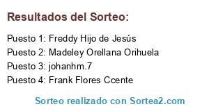Lista de participantes: dilm2323, johanhm.7, maxjensdiaz, el_anny11, fl0rci74_dom1, edwin_victor, jorge.blasblas.7, renzexpp, carlo_jotach, juankaise, manuucaa_, Quilca Baldeon Bryam Yermi, Frank Flores Ccente, Renzo Peña Peña, Paula Cruz Navarro Rios, Edwin Victor Gallegos Quispe, Jhon Carlos AC, Alberto Castillo, Renato Chavez Hidalgo, Daniel Quispe Alvarez, Teresa Mesones, Madeley Orellana Orihuela, Mario Hurtado Bravo, Max Cóndor Arroyo, Juan Acosta S, Eduardo Frank Pariona Camargo, Fredy Rolan Marmanillo Porras, Jhosep Arotinco Francia, Ke Nnyi, Valdev Ricardo, Freddy Hijo de Jesús, Javier Rospigliosi.