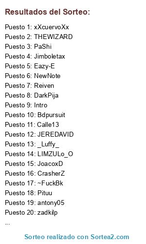 Lista de participantes: LowProfile, Pupycja, _-NEKOH-_, Figux, B-kazer, Aj-lord, Pipas, Tape, SmLucifer, AltaFacha, BlakeFood, TuyasabeS, Casiana, iRushDown, _Luffy_, J-nikol., LordGuachi, PaShi, Styfler, -GoPro-, Jimboletax, GuardiaN-, CrasherZ, ~Tayler~, TatiJA, Mammoth, PibeTigre, fofodAking, DarkSh4rT, ~FuckBk, VIDELA, Mr.Pooh, -antoz-, Magancio, Trident, REDIMI2, Cokeinn, J00NII, MG_VLADI, Escannor, Collapse, JACKS, MAS7ER, BloodyMary, Yassuo, -Burzac-, MiniRaff, BM420, Fussy, xXcuervoXx, xElRober, SarumaN-, BK__Groox, Leo_xon, Guardian~, KAZUO, xXfenixXx, -RanSes-, zDanieL, antony05, Lask, MerlinN, 0neHit-, Ph4ntom, -zimet-, BkMarlon, Rekex3, Reiven, NDmoniado, Mutoumbo, SaTrYx, noriel, Dk-Lucero, AndroiD, Dark-Shaka, BlackWizard, SakurObi, Overtime, NeveRPonny, Chuky666, DemieN, BurBruja-M, -Riddlex-, Gonzak, JoacoxD, Stteffano~, _Vulcano_, Bk-Goat, Albertoc, RicoteroPR, ResaK2,-, -hypro-, sirdios, Bdpursuit, -Simplex-, ElPuYa, Yugo, Lautj4sx, Intro, BETOCESAR, ~Anonym0us, Arwezo14, Alby, OojorgeoO, Credci, NiicoBk-, Eazy-E, Locately, JEREKAR, cronov7, Ochosy, ManteCool, MG_N, PDybala, APOCALIPTO, Malotex, LoleS, Goood, Chabito, Thanos_25, DJMALIK, RamonDavid, Guga, Madelen, -Torqe-, VpStephan, CENTU22, zadkilp, Sensui, R3TROM1L, Jameskelof, Son-Goten, CrazyBlade, Lary, Laautii_Lg, Eliass, HittlerKK, ziion, Abyss, LilFedee, FRANKO_45, Mago3g, NewNote, WeedSM, -RONDON-, Shinku~, MG-FLEME, Mg_Rex, Chiara12, Rayzer, MIGUEBK, GLOBACK, GoreGore, -Tavo-, Pino, Frutita, 2XFERCHUX2, BLACKDROCK, Hanbal, kanata, Laurenz, Anestesia, LIMZULo_O, Rapist, ~WinWin~, JOYNER, Nelson_dk2, Apolux, Calle13, iLike, Vaniro, Battleship, Goku16, BkSilentD, Bkzzz, Zeuldrack, SoNiC~, Bk_Adrian, Trap, Ubii, Kamijou, -GoSave-, NightMare, Kyubii, ZEUSDL, THEWIZARD, WingSBlacK, ViewS, YORGELYZ, JEREDAVID, Pituu, HardCor3, -SIipknoT-, damagedd, 0Kanox, DarkPija, JHOSWEL.