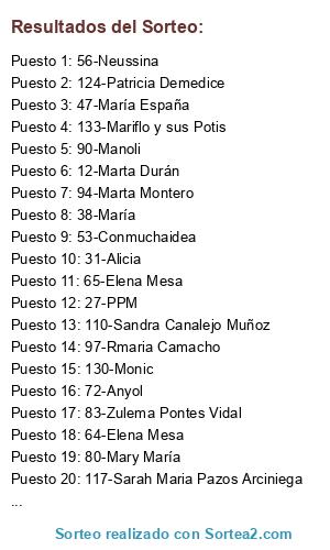 Lista de participantes: 1-Inés Rocha, 2-Inés Rocha, 3-Magan, 4-Magan, 5-Mónica Ripoll, 6-Mónica Ripoll, 7-David M, 8-David M, 9-Elena García, 10-Elena García, 11-Marta Durán, 12-Marta Durán, 13-María Luisa, 14-María Luisa, 15-Ana Fandango, 16-Ana Fandango, 17-Maite, 18-Maite, 19-Mari Carmen Guerra, 20-Mari Carmen Guerra, 21-Vanesa Fraile Cáliz, 22-Vanesa Fraile Cáliz, 23-Mar Alonso Regueira, 24-Mar Alonso Regueira, 25-Victoria, 26-Victoria, 27-PPM, 28-PPM, 29-Deborah Tg, 30-Deborah Tg, 31-Alicia, 32-Alicia, 33-Kelika, 34-Kelika, 35-Kelika, 36-María, 37-María, 38-María, 39-Soledad Rodríguez López, 40-Soledad Rodríguez López, 41-Estefanía, 42-Estefanía, 43-Maite S.P., 44-Maite S.P., 45-Claudia Ceballos, 46-Claudia Ceballos, 47-María España, 48-María España, 49-Paula Nave, 50-Paula Nave, 51-Silvia Bartolomé, 52-Silvia Bartolomé, 53-Conmuchaidea, 54-Conmuchaidea, 55-Conmuchaidea, 56-Neussina, 57-Neussina, 58-Nené PF, 59-Nené PF, 60-Nerea González, 61-Nerea González, 62-María Rosa, 63-María Rosa, 64-Elena Mesa, 65-Elena Mesa, 66-Carmen Trujillo, 67-Carmen Trujillo, 68-Xandra Miguelez, 69-Xandra Miguelez, 70-Xandra Miguelez, 71-Anyol, 72-Anyol, 73-Anyol, 74-Darmy, 75-Darmy, 76-Nuria Macías García, 77-Nuria Macías García, 78-Carolina Roger Manzano, 79-Carolina Roger Manzano, 80-Mary María, 81-Mary María, 82-Zulema Pontes Vidal, 83-Zulema Pontes Vidal, 84-Zulema Pontes Vidal, 85-Mary Code Neira, 86-Mary Code Neira, 87-Vanessa Fernández, 88-Vanessa Fernández, 89-Manoli, 90-Manoli, 91-Paqui Risquez, 92-Paqui Risquez, 93-Marta Montero, 94-Marta Montero, 95-María, 96-María, 97-Rmaria Camacho, 98-Rmaria Camacho, 99-Isabel, 100-Isabel, 101-Maria López Iglesias, 102-María López Iglesias, 103-Sonia, 104-Sonia, 105-María Ángeles Díaz Peinado, 106-María Ángeles Díaz Peinado, 107-Patricia Espada Sesar, 108-Patricia Espada Sesar, 109-Sandra Canalejo Muñoz, 110-Sandra Canalejo Muñoz, 111-Tamy, 112-Tamy, 113-Luisa Menargues, 114-Luisa Menargues, 115-Virginia Acevedo Nuñez, 116-Virginia Acevedo Nuñez, 117-Sarah Maria Pazos Arciniega, 118-Sarah María Pazos Arciniega, 119-Ruth Sanjuan, 120-Ruth Sanjuan, 121-Mónica Casas Angullo, 122-Mónica Casas Angullo, 123-Patricia Demedice, 124-Patricia Demedice, 125-Lidia Casademont, 126-Lidia Casademont, 127-David Sánchez, 128-David Sánchez, 129-Monic, 130-Monic, 131-Pedro, 132-Pedro, 133-Mariflo y sus Potis, 134-Mariflo y sus Potis, 135-Mariflo y sus Potis, 136-Ángeles Casas Robles, 137-Ángeles Casas Robles, 138-Ángeles Casas Robles, 139-Susana, 140-Susana, .