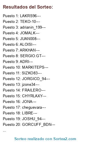 Lista de participantes: ARKHAN---, PUTOKASTY!---, JOSHU_94---, JORGICO_94---, RECOBE---, GORCUFF_BDN---, ALOISI---, JUAN008---, FRU_FRU, C-JOSELINHO---, JONA---, BELSHE1---, JOMALK---, SIZKO83---, MARCSANCHEZ---, SERGIO.GT---, JUANMA---, LAKRS96---, ADRI---, TEKO-10---, FRAGA_96---, RHULO---, adrianin_199---, jzone34---, cheguevara---, INES_98---, CHYRLAXY---, MARKITEPS---, FRAILERO---, LIBRE---.