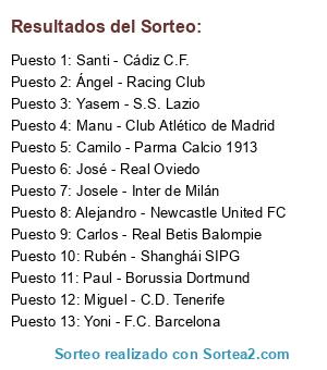 Lista de participantes: Paul - Borussia Dortmund, Miguel - C.D. Tenerife, Santi - Cádiz C.F., Manu - Club Atlético de Madrid, Yoni - F.C. Barcelona, Josele - Inter de Milán, Alejandro - Newcastle United FC, Camilo - Parma Calcio 1913, Ángel - Racing Club, Carlos - Real Betis Balompie, José - Real Oviedo, Yasem - S.S. Lazio, Rubén - Shanghái SIPG.