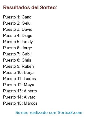 Lista de participantes: Mayu, Jorge, Gelu, Alberto, Chris, Marcos, Txirbis, Ruben, Cano, Alvaro, Diego, Gabi, Landy, David, Borja.