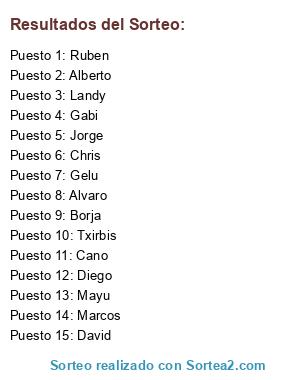 Lista de participantes: Mayu, Jorge, Gelu, Alberto, Chris, Marcos, Txirbis, Ruben, Cano, Alvaro, Diego, Gabi, Landy, David, Borja.