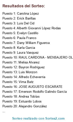 Lista de participantes: Maribel Suarez, César Chacón, Ana Elizabeth Flores Villela, Nilson Ordoñez, Katia Tejeda de Cabrera, Gabriela Escobar, Saraí Velásquez, Claudia Vargas, Aleida González, Miriam Lily Franco Cabrera, Karla Garcia, Estuardo Lobos, Herberth Arevalo, Alejandra Reyes, Francisco Herrera, Melisa Alvarez, Nidia och, Raul Garcia, Revin Aguilar, Sasha Soto, Mirsha Alvarado Méndez, ILEANA RODRIGUEZ, Angelica Méndez, Annelise Talavera, Andrea Tobías, Alejandro González, Danny Del Cid, Erika Mendoza, Luis Del Cid, Melvin González, Gabriela Arias, Hugo Sagastume, Jorge Luis Morales Escobar, Catherine Andrea Hidalgo Arevalo, Jaime Fernando De la Cruz Villatoro, Paola Gutiérrez, Vima Batz, Ale Figueroa, STUARDO GARCIA, BYRON LOPEZ RODAS, Eric Fernando Aguilar, María Renée Fuentes, JORGE ANTONIO CASTILLO ROSARIO, Sindy Mariana Tobar Mejia, Erick Osorio, Elvis Lemus, Grace Anabella Del Cid Chiguichon, Cinthya Sandoval, Otto Rene Bautista, Ricardo Escobar, Nancy Alvarez, Alfredo Echeverria, Jose Antonio Maldonado Milian, Erick Barillas, Mishell Grajeda, MARISOL GARCIA, JUAN CARLOS ESCARATE, JOSE AUGUSTO ESCARATE, Emerson Rodolfo Galindo García, Christian Barneond, Lesly herrarte, Evelyn Castillo, Ericka Villagran Mazariegos. VM. XELA, Sandra Callejas, Sharon Sandoval, Marlon Brando Cruz Pérez, Leonel Lopez Chenal, Jorge Valenzuela, Dany William Figueroa, Ilma Quijivix, Laura Vasquez, Carla Herrera Brolo, BOANERGES FRANCISCO FLORES HERRERA, Angélica Marisol Menchú Barrientos, Sayra Garcia, Jose Jorge Aguilar, Bayron Rodriguez, RAUL CARDONA - MENSAJERO OLE, Sergio Marroquin, Wilson Calderón, Paula Franco, Jaime Leonel Lopez Zeledon, Daniel Vargas, ANGELICA MARISOL MENCHU BARRIENTOS, OMAR SUM, Alberth Giovanni López Rodas, Carolina López, Garcia Cruz Edwin Estuardo - Policia bodega, Monroy Geovani - Limpieza bodega, Dennis Sosa, Fidel Lacunza, Fernando Rodriguez Rergis, María Romelia Alvarado Figueroa, Ana Gabriela De León, Marvin Arana Solis, Luis Monzon, Luis Alfonso Velasquez, Ernesto Sandino, Rhina Ayala, Manuel Illescas, Monica Pulido, Dora Hernandez, Debora de la cruz, Juan Pedro Sandoval, Waleska Aguilar, Ronald del Valle, Kenneth Quan, Alicia Ortega.