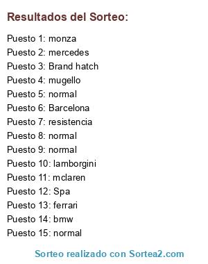 Lista de participantes: Barcelona, Brand hatch, Spa, mugello, monza, bmw, lamborgini, ferrari, mercedes, mclaren, normal, normal, normal, normal, resistencia.
