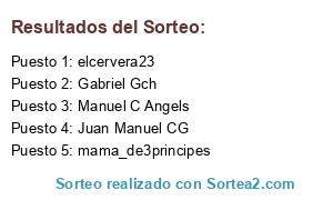 Lista de participantes: Gabriel Gch , Marta Meneses Martinez , Juan Manuel CG , Manuel C Angels , mama_de3principes , martameneses83 , santtosss12 , jesusdarknoise , juansanchezu1985 , elcervera23.