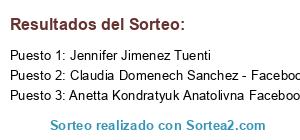 Lista de participantes: Claudia Domenech Sanchez - Facebook, Dolors Marti Facebook, Andrea Simarro Facebook, Elena Ortigosa Bea Facebook, Kevin Cosyns Facebook, Mar Diaz Garbayo Facebook, Aleli Cogan Facebook, Ana Bel Polo Facebook, Marc Galimany Facebook, Alison Riveros Patiño Facebook, Dolors Ortiz Berdun Facebook, Jennifer Jimenez Tuenti, Susy Unica Tuenti, Mamen Rodriguez Guerrero Tuenti, Alba San Jose Perez Tuenti, Estíbaliz Fatairi Tuenti, Gema Foresi Tuenti, Elisabet Perez Tuenti, Anetta Kondratyuk Anatolivna Facebook, Laila Gallego Facebook.