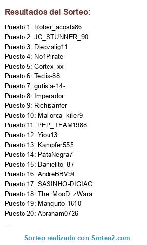Lista de participantes: AlexAlguacil_8, Henkdenhaag, PataNegra7, SASINHO-DIGIAC, Danielitoperu10, Sam---, Young_Pro97, Miguel_Ruano, ReDerHugo, JC_STUNNER_90, Zeusinjo, Adrianmaese, Barboza12_, B10_joker, Yiou13, erkobra18, DAMI_ALMENARA, Abraham0726, Imbaedo1, Mokispucela, KaiSter, Kampfer555, Petros_1610, Stejinn7, Oreld123, Josecr23, Bekobic, Elayuwoki11, gutista-14-, Diepzalig11, Clapped_by_mv, INDOMINATOR, KaiSER-SH7, Mehman, Alex209204, Sem___1907, Richisanfer, AndreBBV94, Ekoh, No1Pirate, AlonsoGrayFox, Danielito_87, Deivynmelo, Manquito-1610, Pirujin23, Lolito_22, DorianFear, Imperador, ALE87_ITA, Jorgelm7, Teclis-88, Rafana, Cases_89, RoblessGG1, Mallorca_killer9, Plantifulbat7, Cortex_xx, Marlito12, Jock_86, PEP_TEAM1988, Rober_acosta86, Dominho3, Tililis, The_MooD_zWara.