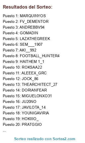 Lista de participantes: LUCASSF_10, DORIANFEAR, KAMS10_, FV_DEMENTOR, GOMADIN, FOOTBALL_HUNTER4, CLAPPED_BY_MV, YOUNIGAVIRIA, CASES_89, MIGUEL_RUANO, JU20NO, EXON_TOGA_10, ITURRAUSBITX, ALEEEX_GRC, ROKSAA22, JOCK_86, PANOSBOUL-26, MARQUINYOS, GREEK-MAFIA, ANDREBBV94, JAVILOTA_14, MICKEY94120, PAUUU24, MIGUELONXO31, AKI__992, HAITHEM 1_1, PRATGGIO, DURBE_, HOKIIIO_, LAZATHEGREEK, THEARCHITECT_27, SEM___1907.