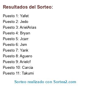 Lista de participantes: Jsm, Bryan, Aguero, Jcarr, Yank, Carcia, ArielArias, Yafet, Jedo, Arielcf, Takumi.