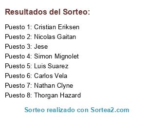 Lista de participantes: Stefan Ruffier, Simon Mignolet, Cristian Ansaldi, Nathan Clyne, Gary Cahill, Nicolas N, Koulou, Aymen Abdennour, Konstantin Manolas, Sergio Busquet, Joan Cabaye, Granit Xhaka, Lars Stindl, Cristian Eriksen, Nicolas Gaitan, Carlos Darwin Quintero, Carlos Vela, Fabian Orellana, Jese, Adem Ljajic, Benjamin Moukandjo, Luis Suarez, Thorgan Hazard.