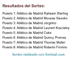 Lista de participantes: Atlético de Madrid Vicente Guaita, Atlético de Madrid Marcel Schmelzer, Atlético de Madrid Dani Alves, Atlético de Madrid Laurent Koscielny, Atlético de Madrid Georginio Wijnaldum, Atlético de Madrid Derick Tshimanga, Atlético de Madrid Javi Martinez, Atlético de Madrid Oguzhan Ozyakup, Atlético de Madrid Mateo Musacchio, Atlético de Madrid Thomas Muller, Atlético de Madrid José Callejón, Atlético de Madrid Quincy Promes, Atlético de Madrid Giovanni Sio, Atlético de Madrid Wellington Silva, Atlético de Madrid Yannick Ferreira carrasco, Atlético de Madrid Jesus Corona, Atlético de Madrid Moussa Sissoko, Atlético de Madrid Jorginho, Atlético de Madrid Coke, Atlético de Madrid Raheem Sterling, Atlético de Madrid Roberto Firmino, Atlético de Madrid Lass Diarra, Atlético de Madrid Moussa Marega.