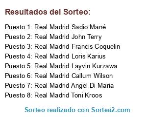 Lista de participantes: Real Madrid Koen Casteels, Real Madrid Pepe, Real Madrid Sami Khedira, Real Madrid Philipp Lahm, Real Madrid Loris Karius, Real Madrid Casemiro, Real Madrid Mesut Ozil, Real Madrid Angel Di Maria, Real Madrid Toni Kroos, Real Madrid Sadio Mané, Real Madrid Patrice Evra, Real Madrid Cristiano Ronaldo, Real Madrid John Terry, Real Madrid Aaron Ramsey, Real Madrid Francis Coquelin, Real Madrid Ramiro Funes Mori, Real Madrid Claudio Beauvue, Real Madrid Vitorino Hilton da Silva, Real Madrid Victor Wanyama, Real Madrid Callum Wilson, Real Madrid David De Gea, Real Madrid Layvin Kurzawa.