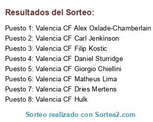 Lista de participantes: Valencia CF Luka Modric, Valencia CF Dries Mertens, Valencia CF Blaise Matuidi, Valencia CF Hulk, Valencia CF Giorgio Chiellini, Valencia CF Bernd Leno, Valencia CF Alex Sandro Lobo, Valencia CF Sokratis, Valencia CF Juan Cuadrado, Valencia CF Alex Oxlade-Chamberlain, Valencia CF Filip Kostic, Valencia CF Matija Nastasic, Valencia CF Juan Quintero, Valencia CF Daniel Sturridge, Valencia CF Igor Akinfeev, Valencia CF Cedric Bakambu, Valencia CF Radja Nainggolan, Valencia CF Gabriel Paulista, Valencia CF Cedric Soares, Valencia CF Mikel Balenziaga, Valencia CF Bruno Martins indi, Valencia CF Matheus Lima, Valencia CF Carl Jenkinson.
