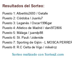 Lista de participantes: Córdoba / Juanlu7, Málaga / juandp88, Atletico de Madrid / dani972806, R.C Celta de Vigo / mikelrcz, St. Pauli / zidenide, Sporting de Gijón - L MOSCA PERRERA-, Leganés / Oscar1996gar, Albertito2693 / Getafe.