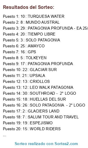 Lista de participantes: 1 AAAVYT, 2 GLACIERS LAND, 3 SOLO PATAGONIA, 4 RUMBO SUR, 5 TOLKEYEN, 6 GIGANTES PATAGONES, 7 SALUM TOUR AND TRAVEL, 8 MUNDO AUSTRAL, 9 HUENEY, 10 TURQUESA WATER, 11 CAL MATE VIAJES, 12 LEO WALK PATAGONIA, 13 CRIOLLOS, 14 ICEBERG, 15 WORLD RIDERS, 16 GPS, 17 PATAGONIA PROFUNDA, 18 HUELLAS DEL SUR, 19 ESPEJISMO, 20 TIEMPO LIBRE, 21 UPSALA, 22 GLACIAR SUR, 23 ZONA PATAGONIA, 24 SOUTHROAD, 25 AMAYCO, 26 SOLO PATAGONIA - 2° LOGO, 27 RUMBO SUR - 2° LOGO, 28 TOLKEYEN - 2° LOGO, 29 PATAGONIA PROFUNDA - EA 25/05 2° LOGO, 30 SOUTHROAD - 2° LOGO.