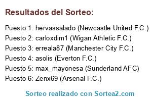 Lista de participantes: Zenx69 (Arsenal F.C.), asolis (Everton F.C.), erreala87 (Manchester City F.C.), hervassalado (Newcastle United F.C.), carloxdim1 (Wigan Athletic F.C.), max_mayonesa (Sunderland AFC).
