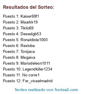 Lista de participantes: Ronaldista1000, Kaiser69f1, Megaiva, Deswdgb53, Fer_vivaelmadrid, Tonijaca, Mariodeleon1011, Rexloba, Tikilo69, Legendkiller1234, Maarkk19, No corre1.