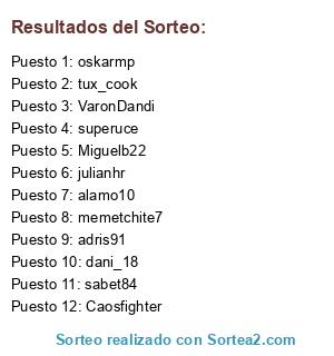 Lista de participantes: adris91, memetchite7, VaronDandi, superuce, julianhr, oskarmp, sabet84, tux_cook, Caosfighter, alamo10, dani_18, Miguelb22.