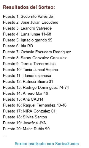 Lista de participantes: Josefina JYA, Rafermo -1, Jose Julian Escudero, Nurita sanz, Teresa Tornerorubio, Julian Sanz muñoz, Socorrito Valverde, Octavio Escudero Rodriguez, Lanumero11, Julio Sanz ZT, Llanos espinosa, Leandro Valverde, Chusmo montalval, Ana CAB14, Ignacio garrido 95, Rodrigo Dominguez 74-74, Marisa Cristóbal García, Luz garrido 11, Maite Rubio 90, Raquel Fernandez 40-46, Arnero Mar 49, Isa Marcos Hernandez, Gonzalez Arias Salvado, Francisco Ventura Bermejo, Silvita Santos, Patricia Sierra 31, Paulina Bravo 7, Sil DZG, PAKI ALFARO 92, NIRA Gonzalez 01, Nuria garcias 1982, Andresito Bellido Montyort 5, Manuel Gara 1969, Luna lunae 11-68, Kakayrita, Tania Juncal Aquino, Iria RD, Ana Caballero (Madrid), Nuria Casal Dopazo (Hospitalet), Zoé Carballa Basdedios(Vigo), Francisco Casal Dopazo(Vigo), Saray Gonzalez Gonzalez, LM Bego(Vigo), Daniel Durán Soto, Beatriz Félix Moreiras.