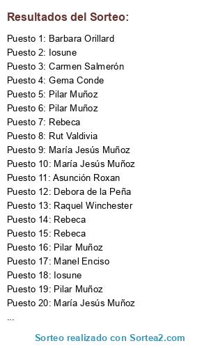 Lista de participantes: Cristina Brutau Bras(3), Tina Adae(3), Rebeca(15), Rut Valdivia(5), Isa Alvaro(5), Mercedes Salmeron(2), Carmen Salmerón(2), Gema Conde, Debora de la Peña(10), Fran Bernal(2), Anna Torné(2), Barbara Orillard(20), Elena Sánchez,, Manel Enciso(2), Asunción Roxan, Pilar Muñoz(10), Iosune(5), Fran, Tina y Tino(6), Raquel Winchester(4), María Jesús Muñoz(10), Viviana Leonor(2).