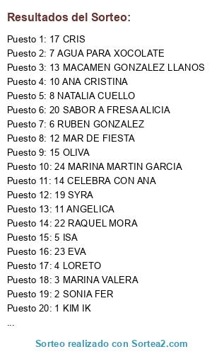 Lista de participantes: 1 KIM IK, 2 SONIA FER, 3 MARINA VALERA, 4 LORETO, 5 ISA, 6 RUBEN GONZALEZ, 7 AGUA PARA XOCOLATE, 8 NATALIA CUELLO, 9 LAURA GARCIA, 10 ANA CRISTINA, 11 ANGELICA, 12 MAR DE FIESTA, 13 MACAMEN GONZALEZ LLANOS, 14 CELEBRA CON ANA, 15 OLIVA, 16 MONSERRAT REGUERA, 17 CRIS, 18 NURIA, 19 SYRA, 20 SABOR A FRESA ALICIA, 21 NURIA, 22 RAQUEL MORA, 23 EVA, 24 MARINA MARTIN GARCIA.