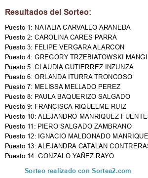 Lista de participantes: CAROLINA CARES PARRA, NATALIA CARVALLO ARANEDA, PAULA BAQUERIZO SALGADO, ALEJANDRA CATALAN CONTRERAS, FELIPE VERGARA ALARCON, PIERO SALGADO ZAMBRANO, GONZALO YAÑEZ RAYO, GREGORY TRZEBIATOWSKI MANGILI, CLAUDIA GUTIERREZ INZUNZA, FRANCISCA RIQUELME RUIZ, ORLANDA ITURRA TRONCOSO, IGNACIO MALDONADO MANRIQUEZ, MELISSA MELLADO PEREZ, ALEJANDRO MANRIQUEZ FUENTES.