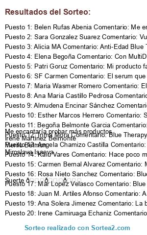 - Ganador 3: Alicia MA Comentario: Anti-Edad Blue Therapy Accelerated, mi piel está hidratada y reduce arrugas.