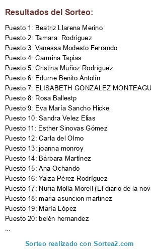 Lista de participantes: Beatriz Díaz, Míriam Méndez Portero, Laura Lacarre, Erkuden Basabe, miriam moran, victor, Elena Pontón, luz, CRISTINA anitsirc, Mari Carmen Sánchez Ramírez, Silvia Roldan, Paula Bruji, Rosalia Villar, almudena valdes, Anna Bonem, Nuria Molla (El Diario de la Novia 2013), maria pastor perez-estrada, sara prieto, pepa pepin, Verónica del Río, Marta Sánchez Seoane, Laura Morales, Marta Liñares, Clara Guevara, María García-Serón Atencia, Raquel Sperides, ARANCHA BARRERA, Elisabet Alvarez, ELISABETH EGM, Lorena Perez, Irene dusolei, Leticia Diaz, Ainhoa aajuria, Sonia Sanz, inma Vidal, anna nitsha, ANNA alvarez, anita rodriguez gonzalez, Beatriz Zamarron, alberto pozo castillo, Cristina Medina Rosa, Silvia silvix, Mabel cansado, alexandra lozano, Elisenda Cases, Sara Gómez, Beatriz Medina Rosa, Mary José Rodríguez, Mónica moboga, vanessa mayor ortega, Ana najla, veronica carrion, Inmaculada Prieto, esther parkinsol, CARMEN kafuazca, Gema Alvarado San Juan, ángelica, Paula baena, Maria Cabello, Laura zgz, rebeca garrido, Celia gf, Montse 666, Raquel raexcar, Juani, PilaR Villanueva, Charo Garcia casuso, Anais Alventosa, Raquel puente, Arancha Martin, Beatriz IP, Lidia Casademont, Ana MN, Elena Vico, GLORIA requena, Victoria Gomez, Eva Pose Bazarra, andrea zorrilla cortes, Raquel García, Noelia simon, Ana Ochando, Marina mibodamifiesta, Patricia Novo Ruiz, Ana Belen Garcia Gonzalez, Mar nuevo, María Fernández de Gorostiza, cristina garcia medeiros, borja uceda marquez, RAQUEL otero, María delasagu, silvia silvi_jh, leticia garcia, maria arminda, maria asuncion, Montserrat educamusica, Rosa pecharroman, Nerea González Cortina, ANA BELÉN TORRES, Pilar Álvarez, Nerea mt, esther cervantes ruiz, Cristina xiky, Laura fernandez, CARMEN MARTINEZ CAMACHO, isabel vert, Irune De la Red, Jesus Reyita, araceli celifarma, Carolina cafegon, Simona larobla, Nuria Salmeron, Marta borlan, Johanna Arco, Mari Carmen Hernandez, Estefanía estephy, Sara Cárdenas, Ingrid Chico, Natalia Sánchez, Clara Suárez Pérez, LAURA catalau81, Meritxell Canales, Natalia koryakina, Beatriz danzarina, Honorina Uceda Jimenez, Maria ramirez, Patrícia joan, Victor mss, sonia tejedor, sonianava, Mua Carmen, Maria Jose Martin Aguado, Míriam Blanco, julia prieto, Lourdes azabache, Lorena Gracia, adriana taekwondo, itxaso, Reyes LA, Mariana Gómez Corzo, Eva Marco, Núria C., Aitzi, Tamara gomez, CARMEN DIAZ, Elisabet alvarez, gloria menor herrera, Carmen menchu, ana maria mayor, Cristina Lopez Alvarez, Tamara del Río, estefania blanco, Jessica Estremera Alonso, Ana Marta Monje, Sandra Velez, Elia Gonzalo, MARTA fernandez, María GD, MAYTE JIMENEZ, Adriana, Ana Belén Torres, Diana Fernandez, Nidia, Paula Riesgo, vane lopez, MIRIAM GALIANO CARRIÓN, Damián Torres Fernández, Maryam, Irene nerei, Sandra Casado, Jorge Zapico, Veronica Ruiz, Ana Calvo, Inma Conesa, gema deli, MARIBEL DELGADO MUÑOZ, Laura noira, Paqui Ramos, sonia sonietamix, Amaia juanjoyamaia, Elena Mesa, Ana Belén García Cívico, Silvia Espinosa de los Monteros, luisa fluixa, Ana Vozmediano, Beatriz SIMÓN GONZÁLEZ, Estefania Carrascosa, Esther Díaz, beatriz medina, belen delgado, sara vicente, tamara mora, Desirée Huerta, Samara, sandra dediego, Silvia 197, Jesús Pérez Cámara, Arantxa Rodríguez, beatriz escribano vacas, alexandra, Celia García, Laura luande, Irene Díaz, Carmen de la Rosa Janer, Elena Y, Lucía Catalá, Verónica Esteban Pla, Rosario Muñoz, Tamara del Rio, Natalia Benéitez, Ana Beatriz Hita Muñoz, lady_lorren, monica kyras, laura raya, María Velasco Montealegre, Nazaret Martínez, Aída, Cristina Boixa, elvira jara, Laura xica de lirio, Ana gatina, Gemma || Myeventconcept, Laura laforma, Laura alcestis.