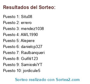 Lista de participantes: Alepere, errero, jordicule5, Raulbanqueri, mendez1038, SamioskiYT, Guifiti123, Situ08, danielcp327, AML1990.