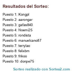 Lista de participantes: felixbm, Pacotaco, Antartic24, Anto1006, Cole41, gafas840, vegasnait, COLLACK, 88raquel, Guillem87, jj_jimenez, Anil76, montecito, Kongpl, POKERBLUFF, jamyone, Noeliah19, Cerveza99, pelocuca, Estari, Andryus, aarongar, Jenini3, AlexUns91, Marin75, dankitio, ian3016, PASCUAL003, ferralge, Noemi25, isab25, Mariu44, Guayako308, josueardila1, fumahita33, Edugamer18, antonito79, maninis, mamite, edurnita7, terrylao, SPEEED81, joseamen, 52207872B, donpe75, frikoo, cuatro jinetes, amigomio, rizos95, DESIREE10, JokJokJok, Miguel35, Josemafade, nando80, crislaura, piglet, ksy677, dragonsboras, Fueyote, kevink0950, pgp1056, pako51, javimarea, manuelcano87, Saray55, cholotortu, Btorpedo66, tatin2307, enolianejr, Tcpiyo, inomolina, Siril4, dalin1990, Monticapo, Dorado 22, metal67, Davizgold, ESPENERPIO, robertodor, sondaris1, cristina6, muitrops23, evamarcos, serludor, adrimena96, tussso22, elmaess, pupilo, robeeer00, FERRANRC, oskitar76, alvsr4cr7, estelamotin, joan2018, toni756, jpekas, Churumbas, rafa756, manoel86, rondista, PerdidosJJ, sinonimo28.