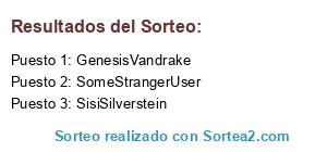 Lista de participantes: inex, Khuzo, Lynx, VG DireWolf, Vicerebro, Doltrex, MonicaSantana, yenay, wetre2000, xKittyPie, Emiven, Dabbido-aniki, Milhie, Sapete, Epsyn, kiarapoke, Puuzly, Guardián Supremo, xßios, MercuryScott, UlisesGonzalezDiaz, Franky, javier_gch, EmilioTavioAlemán, Blanc79, Krumn, Zeki, gregorio samsa, ColorfulCanvas, ReinaGreen, Cropenshield, PywaMeh, mascahierro, Wethepeople, ana vanessa, Pablo M Perez Perez, CarlosJavierPlasenciaMora, Ninive, f3changa, Deadpantiara, LorenaNavarro, DanielLópezLeal, deivy, Skyler26, Nauthilous, Maragor, KevinLrz, rantrix, Risitasnye, FishDck, Cepac, albertenerife95, LeyreSiglerCastello, Dharthas, HijodePescadero, yer noligma, ClayDreY, Demiankai, SoraKawai, AnannyDeDiosGuzmán, IsraelMarijuanRamirez, joeltoledo , Irene05, yesenia02, JorgeLuisCorreaClemente, MaryRodríguezPerera, Richindor, SilviaBlancoLopez, Mikitsujiwaki, Arthyx, gorm, Tracyfg, Mery, Naz, Mx3, Lahfeah, sumlarnurgon, MrKaiser891, Arenisca, ArturoHernándezMosquera, Samurai Spirit, Freeyja, AdriánDaríoMorenoRodríguez, ManuelBarriosGarcia, Gamusina, DanyValencia, CarlosAlbertoAlmenaraAcosta, SergioRamos, ZirabaDraco, NerosiK, Jaimetaks, SisiSilverstein, Jowi, JesusPolloSurf, EricGarcíaGómez, MiguelÁngelFelipePimentel, PichuShow, GabrielTrujilloGonzalez, MarcoPeñaPrunell, Gyxerify, MariaGarcia, Eric Figueroa Frias, ThaisJiménezCandelaria, JavierLimaPerez, GuillerHedezMesa, AngelAguiar, ElioAgonay, VeroGuerra, OswaldoPonceGuerrero, JorgeCastellano, RaulGonzalezRojo, vientodeloeste, markillote, Ennoia7, Liube21, WinterWolf, AnabelDeniz, JWaicok, Ignacio775, Aaron, BrunoRuiz, Jose_HobbyRed, PatriciaHernándezHernández, NoeliaHernándezDomínguez, puti, GenesisVandrake, SomeStrangerUser, RaquelSantosHerrera, SamuuReyes, NoeliaReyes, MelaniaAfonso, LilithBathoryCollings, aserty, MarcosPulidoSuárez, AdrianFigueroaFrias, IvánÁlvarezLópez, SaraiMéndezSilva, MartínEsquivelGarcía, RobertoZaniboni, NicolasAcostaDelgado.860, HobbyRed, Blue, Hyperstoned Limonsio, Aramcix, SaraOkumura, NaruDragneel, vero.gm97, EdiiFalconHernandez, Aima, RydiaValentine.287, HumiureDate, NaraeVharlade, Luci_Santana, Nerehernandez15, Karen_Bravo, Lorena_Rodríguez_Sobrino, Andrea_Cabrera_Castellano, EdyeMelo , Miin_Woo, Kazouie, Scarlet_zomb3r, Samuel_del_Rosario, Victor_Viera_Molina, Kiobry93, Guille1996, alejandrovr, minyoonevx, Sory_Djalo, Esthy, Jose_Luis_Rodriguez_Rodrigues, Mikel_Hernadez_Cabrera, Alba_Perez_Lopez, Emanuel_Quintana, Ruben_Cea_Gonzalez, Brian_Hernandez_Darias, Rmarijuan, NachoSRH, Chenco, Criskrus, jairodg, Superninja, wertu123456789, Javier_Del_Valle_Glez, Marta_Morín, Servando_Garcia, Isaac_Francisco_Martín_Alberto, Yaicko, Kevin_Torres, fego091, adriancog, angelparawhore91, Joanus, Tintins, Alberto_Pérez_Socas, Yuna Blanchett, Aimara_Rodríguez_Hernando, josign, Fernando_Hernandez, .