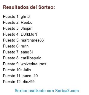Lista de participantes: Julio, carlillospalo, sano31, wolverine_rms, Jhojan, ghrt3, martinares83, D3rkl3oN, ReeLo, rurin, diaz99, paco_10.